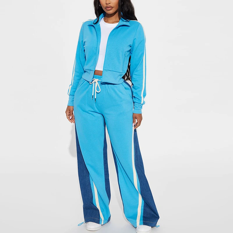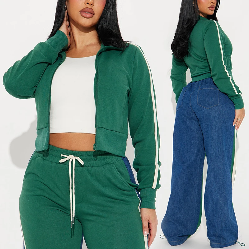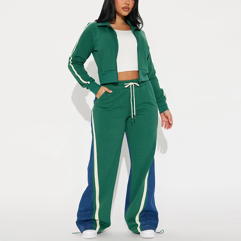 Huili Custom Premium Patchwork Crop Zip up Jacket and Loose Fit Pants Fashion Streetwear Outfits 2 Piece Set Womens Tracksuit